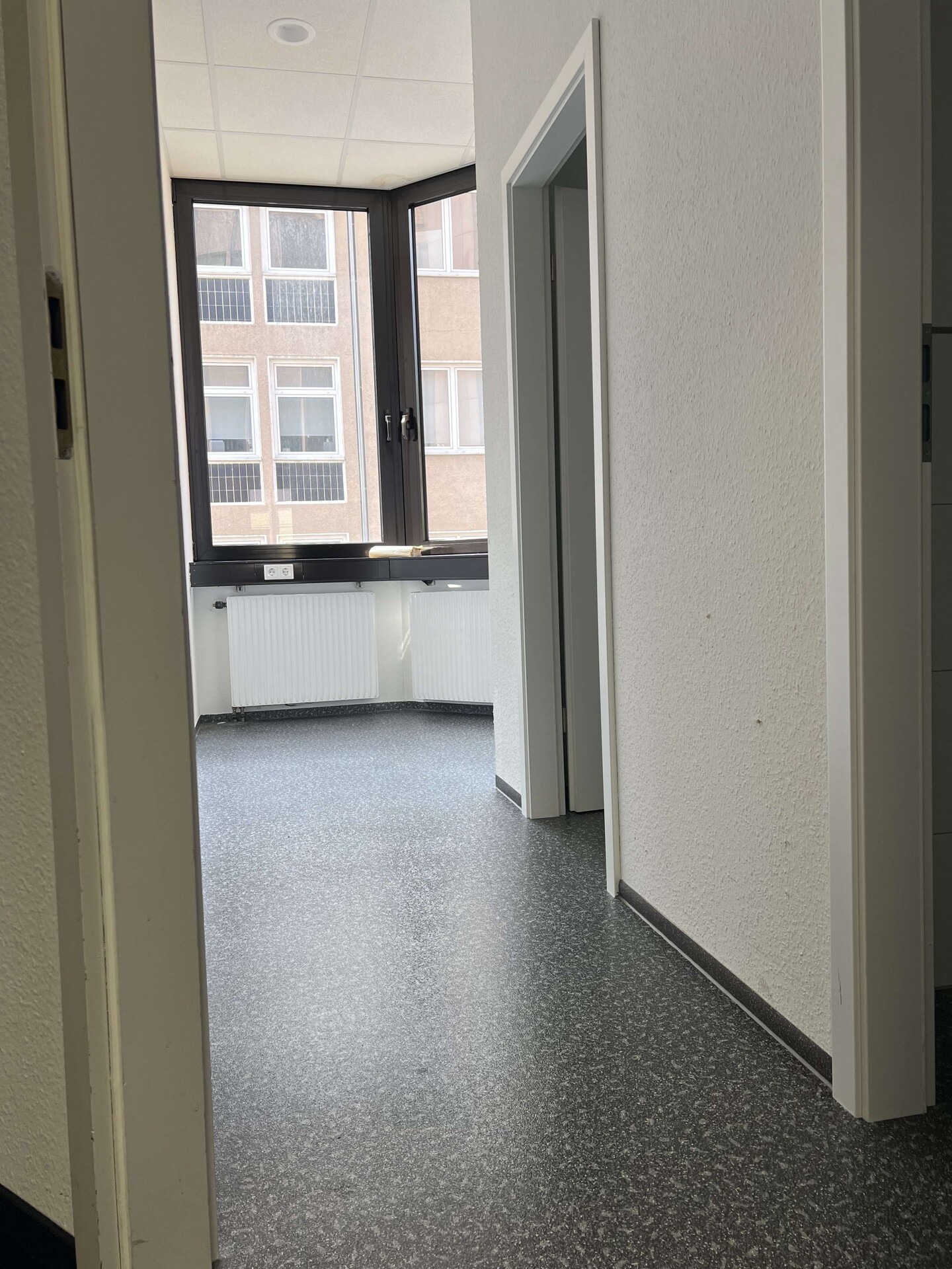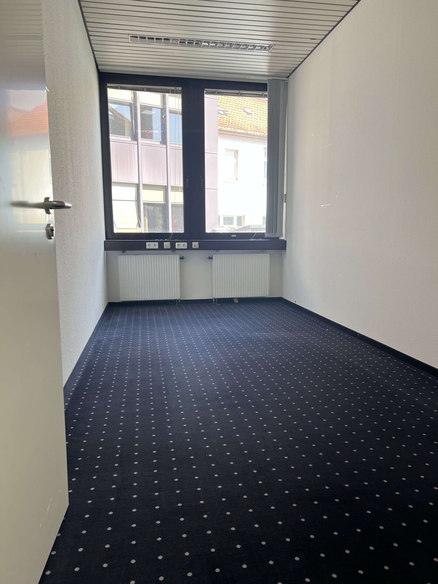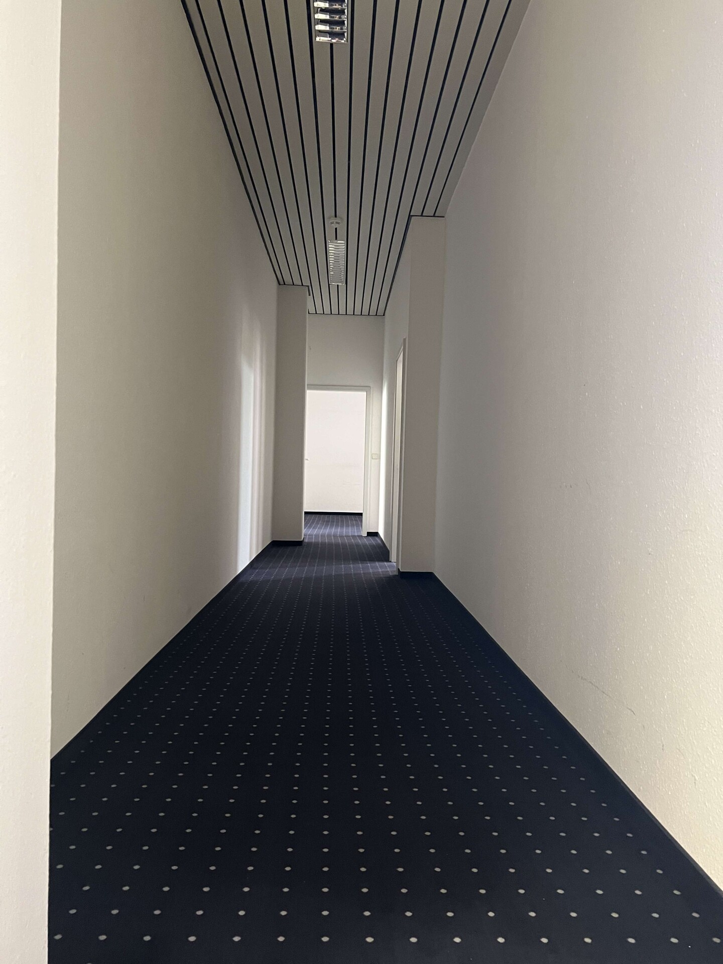 Die Büroräume und der Flur sind mit grau-blauem Teppichboden ausgestattet.