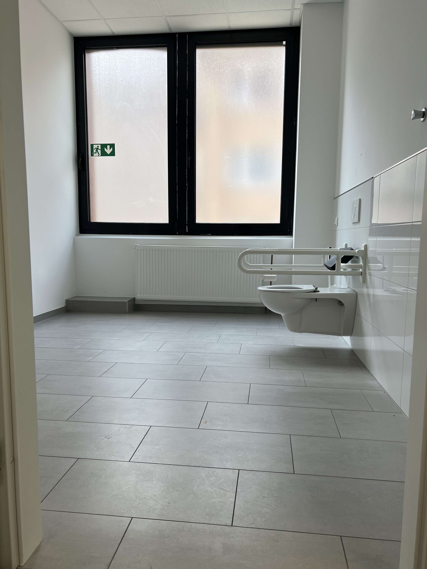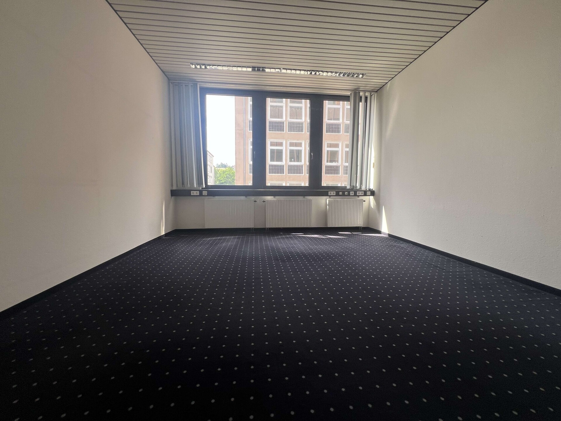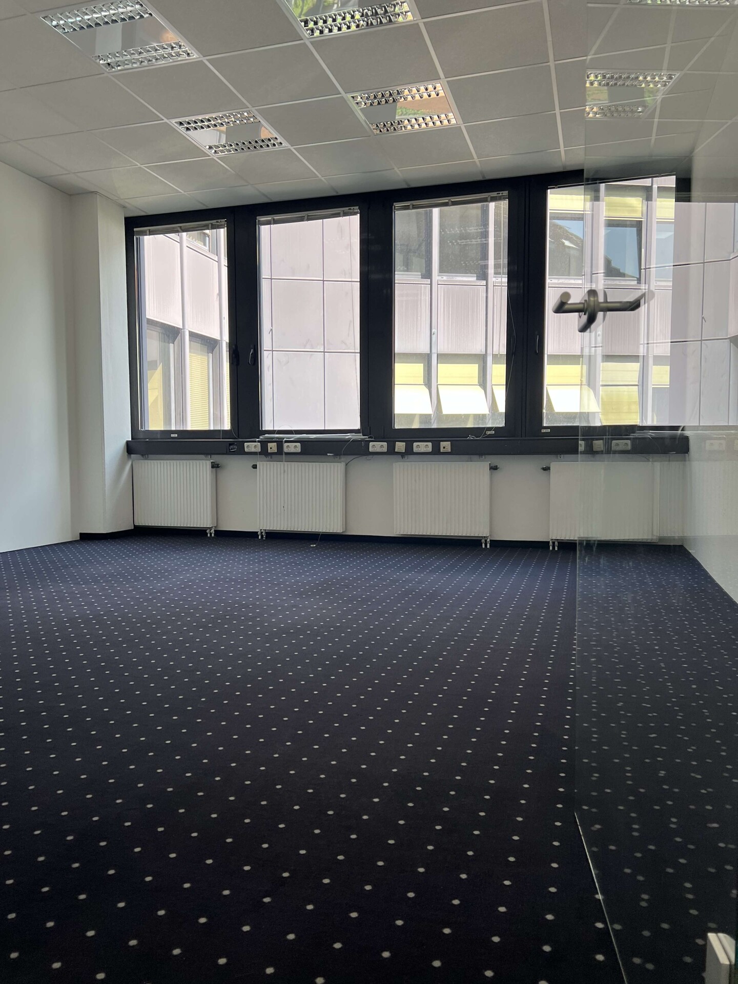 Die Büroräume und der Flur sind mit grau-blauem Teppichboden ausgestattet.