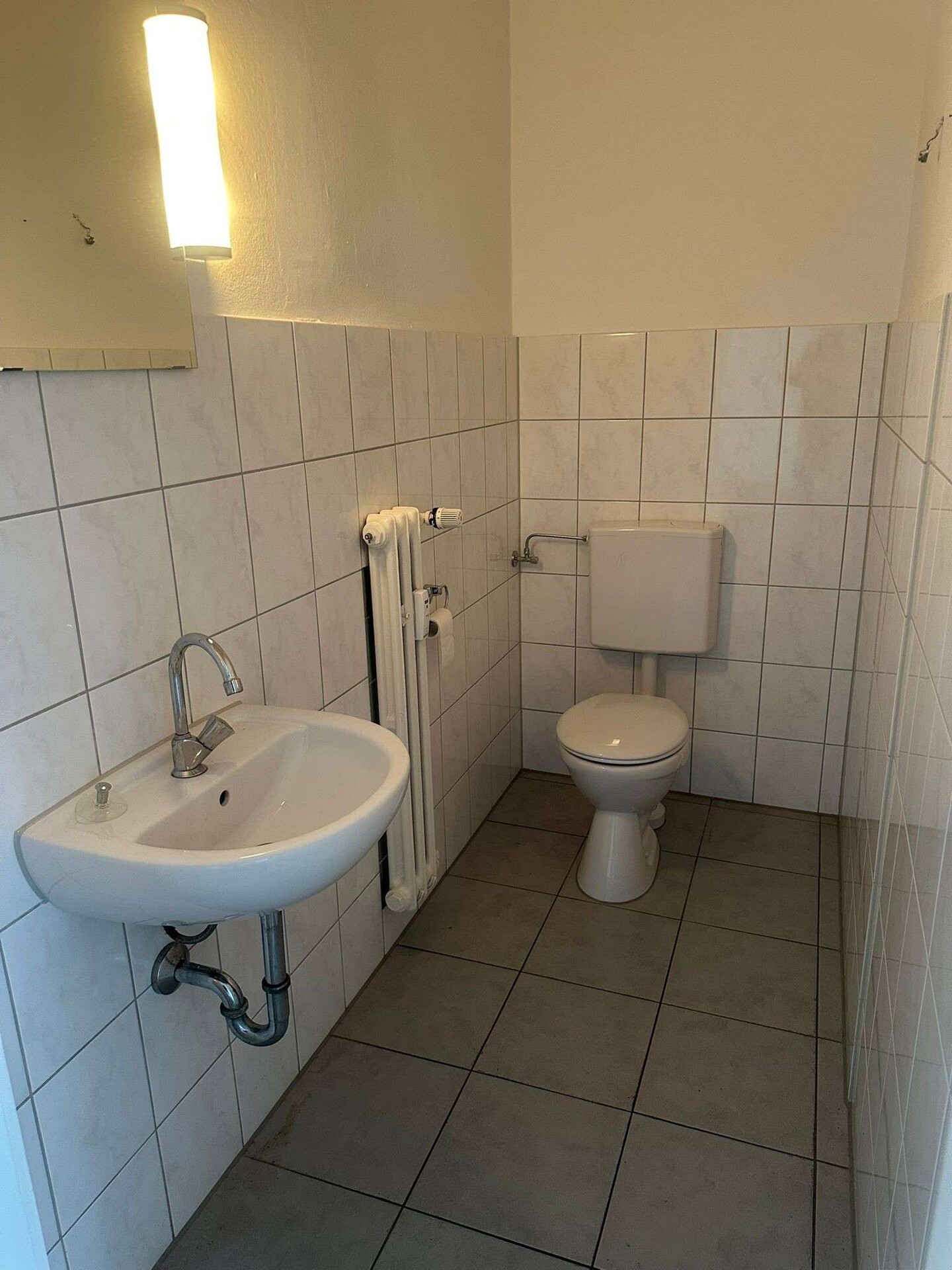 Ein schlicht gehaltenes weißes Bad bietet zusätzlichen Komfort und rundet das Bild ab.